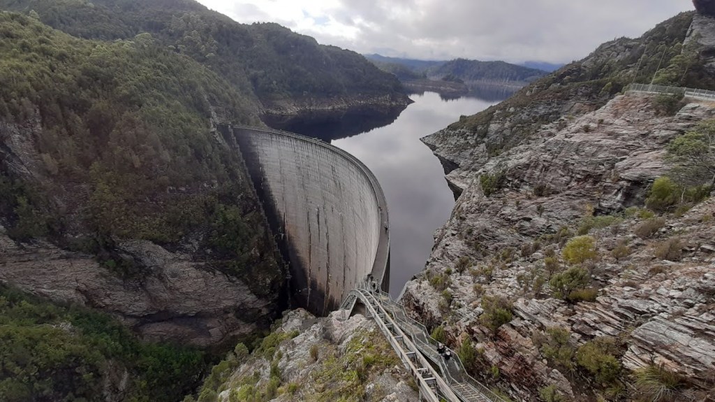 Zostawmy te rozważania i wróćmy do naszej wycieczki. Tama robi ogromne wrażenie. Wysoka na 140 metrów jest największym tego typu obiektem w Australii. Dookoła jest kilka punktów widokowych, a sam szczyt obiektu również jest otwarty dla turystów, więc ze wszystkich stron możemy oglądać tamę, jezioro i dolinę rzeki Gordon. Niestety tego dnia jest szaro i deszczowo, a w dodatku o godzinie 16:00 zaczyna się już robić ciemno. Wizyta tutaj w słoneczny, letni dzień gwarantuje o wiele lepsze wrażenia. Ustawiamy się więc na szybką sesję, robię dosłownie kilka fotek okolicy, żegnamy się z klubowiczami i ruszamy w drogę powrotną.