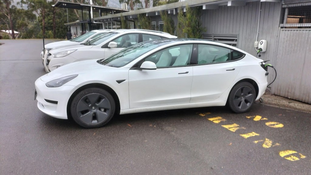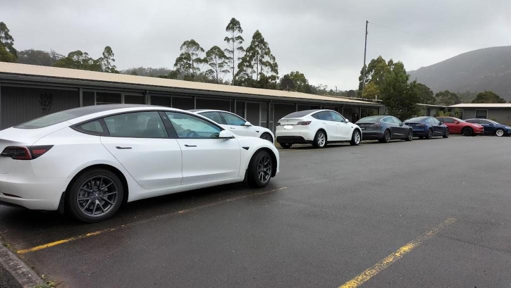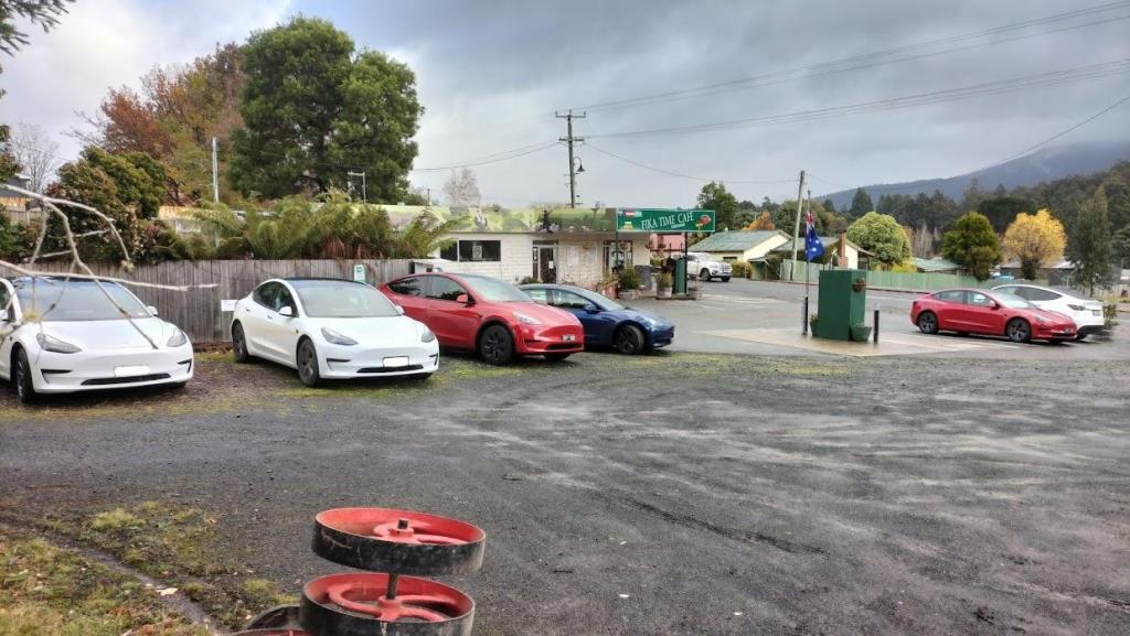 Na pierwszą przejażdżkę z klubem jedziemy dziewicze, zachodnie rejony stanu, do miejscowości Strathgordon, gdzie znajduje się największa elektrownia wodna w Australii. Jak to w maju, jest trochę szaro i mokro, a szczyty okolicznych gór pokrywa już cienka warstwa śniegu. Nie zniechęca nas to, bo w samochodzie mamy wygodnie i ciepło. Z pełną baterią jedziemy do punktu zbiórki – miejscowości Maydena. Ta maleńka mieścina jest dobrze znana w kręgach miłośników rowerów górskich, znajduje się bowiem słynny na całą Australię tor zjazdowy (downhill). Nas jednak dziś nie interesują rowery, a mała kafejka przy głównej drodze. Fika Time Café oferuje nie tylko wyśmienitą kawę, ale też stację ładowania. 24 kW to nie oszałamiająca moc, ale wystarczy, żeby w klika minut doładować się o kilkanaście procent. Frekwencja przyzwoita – 10 samochodów, głównie Modele 3 i Y, ale jest też luksusowy Model X – flagowy model marki. Po raz pierwszy spotykamy pozostałych członków klubu. Mili ludzie. Pijemy kawę i rozmawiamy oczywiście o samochodach.