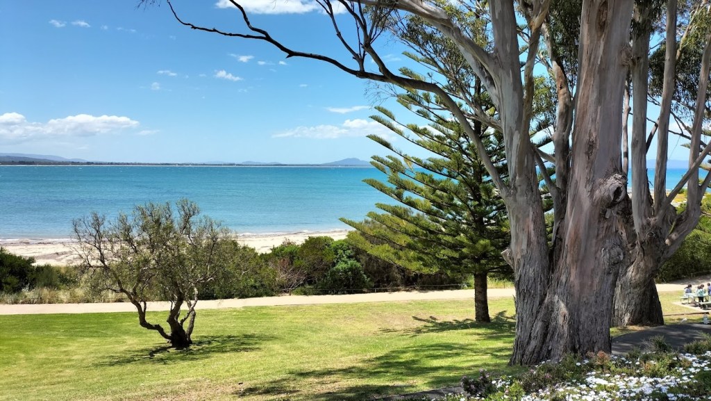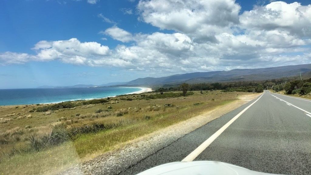 Od tego momentu jazda to czysta przyjemność. Droga na południe wzdłuż wschodniego wybrzeża jest prosta, bezstresowa i niemal cały czas zachwyca pięknymi widokami. Znów przez szybę samochodu zauważamy kilka miejsc, które na pewno warto kiedyś odwiedzić na dłużej. Szczególnie przykuwa uwagę wyspa Diamond Island nieopodal miejscowości Bicheno. Podczas odpływu można tam dojść suchą stopą, przypływ odcina wyspę od lądu. Woda dookoła wydaje się ciepła i czysta. Bez wątpienia jeszcze kiedyś tu wrócimy.